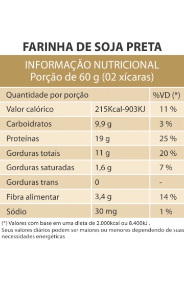 A farinha de soja preta é rica em antocianina, substância responsável pela coloração da casca da soja preta, possui poderoso efeito antiobesidade, as isoflavonas contidas na farinha de soja preta, também oferecem ação protetora contra o câncer.