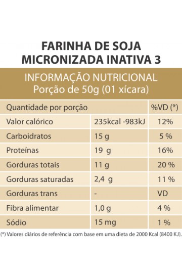 Grãos rigorosamente selecionados, submetidos a um tratamento térmico e micronização mantendo integralmente as características nutricionais do grão. Possui todos os aminoácidos essenciais, além de ser rica em fibras, proteínas e ferro. Contém vitaminas do complexo B, isoflavonas, ácidos graxos poliinsa-turados e é fonte de cálcio.
